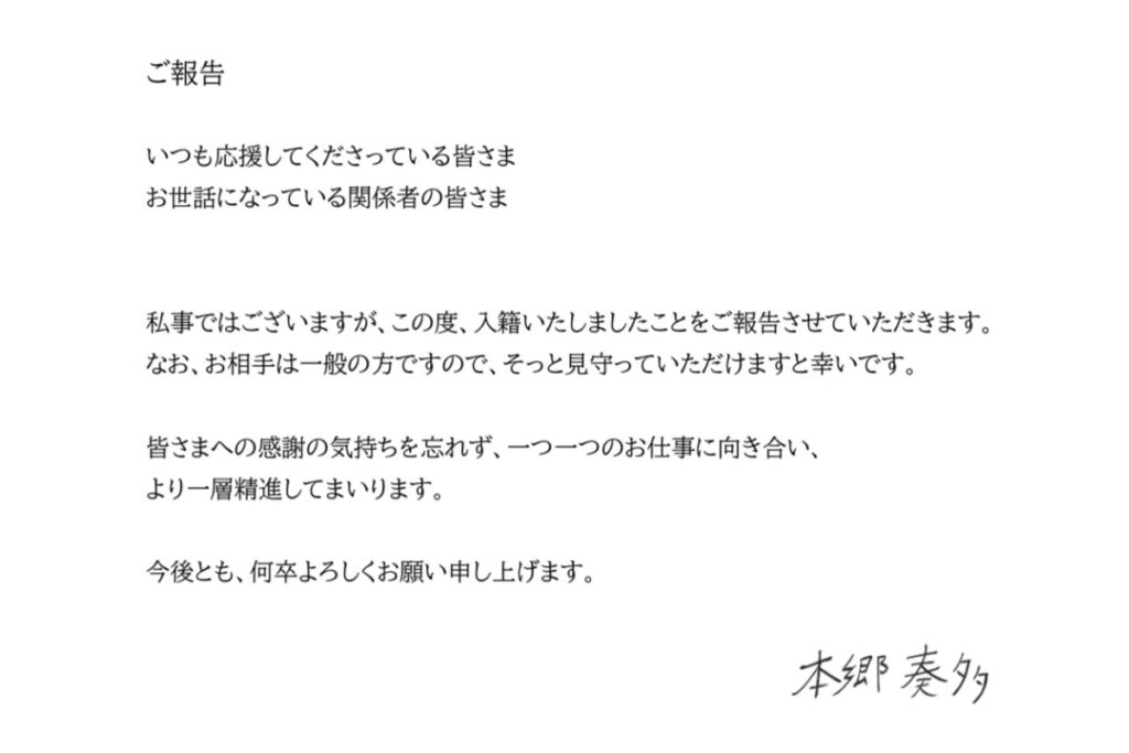2026年1月1日、本郷奏多さんは自身のX(旧Twitter)を更新し、直筆の署名が入った文書で結婚を報告しました。