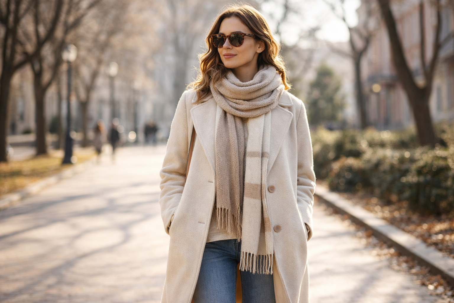- **小物**: ショートブーツ、ストール、ベレー帽