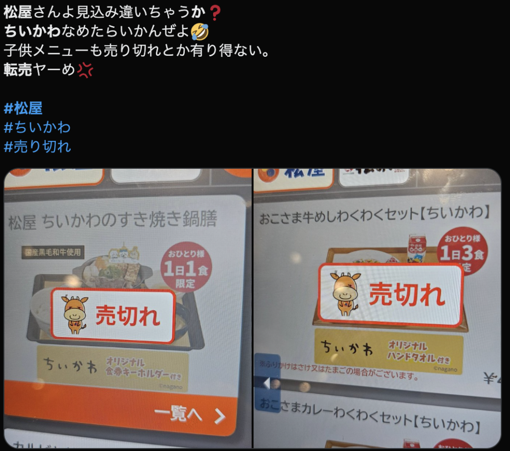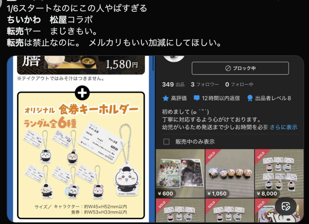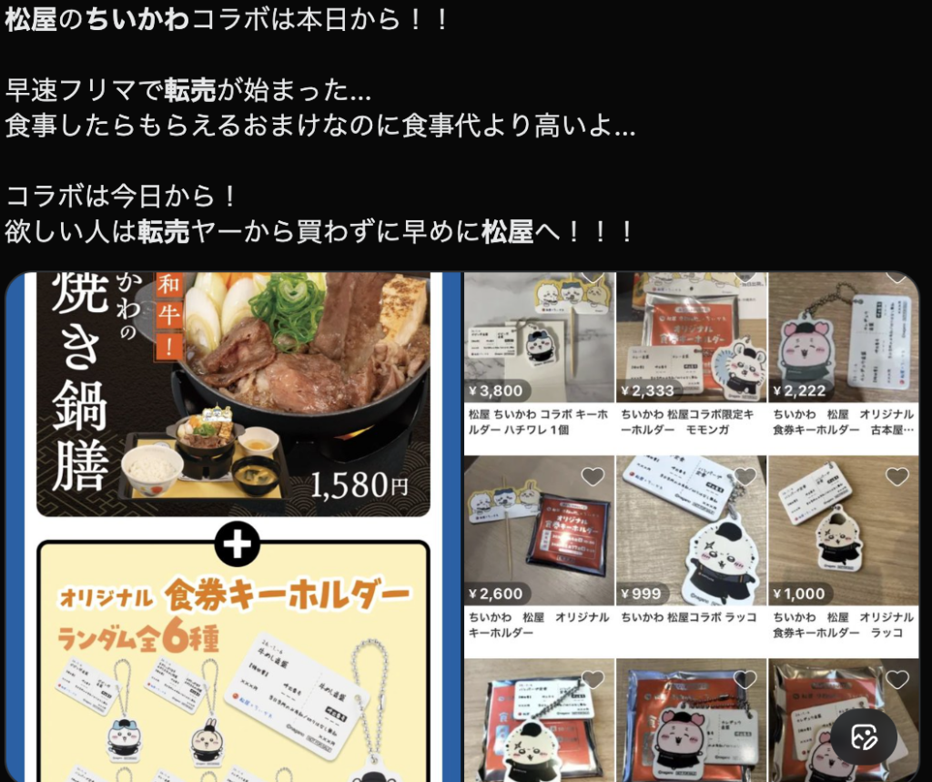 「10時半に行ったのにもう目の前で売り切れた。転売ヤーのせいで純粋に楽しめないの、本当にやめてほしい」「松屋のちいかわコラボ、1時間で売り切れて、すでにXやメルカリで転売されてる」「普通に2倍くらいの価格で転売されてて最悪」といった声が相次いでいます。