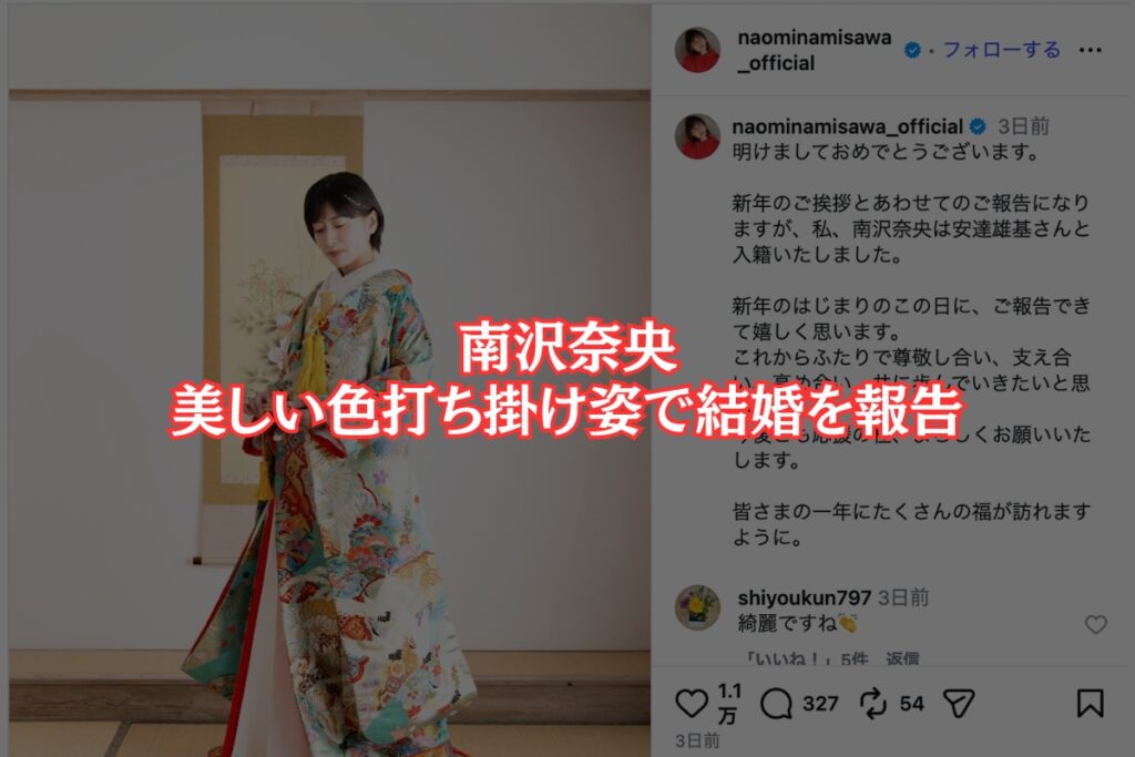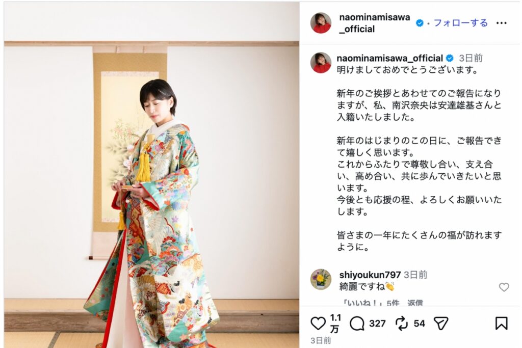 2026年1月1日、南沢奈央さんは自身のInstagramを更新し、美しい色打ち掛け姿の写真とともに結婚を報告しました。