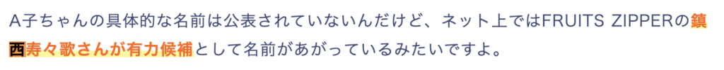 A子ちゃんの具体的な名前は公表されていないんだけど、ネット上ではFRUITS ZIPPERの鎮西寿々歌さんが有力候補として名前があがっているみたいですよ。