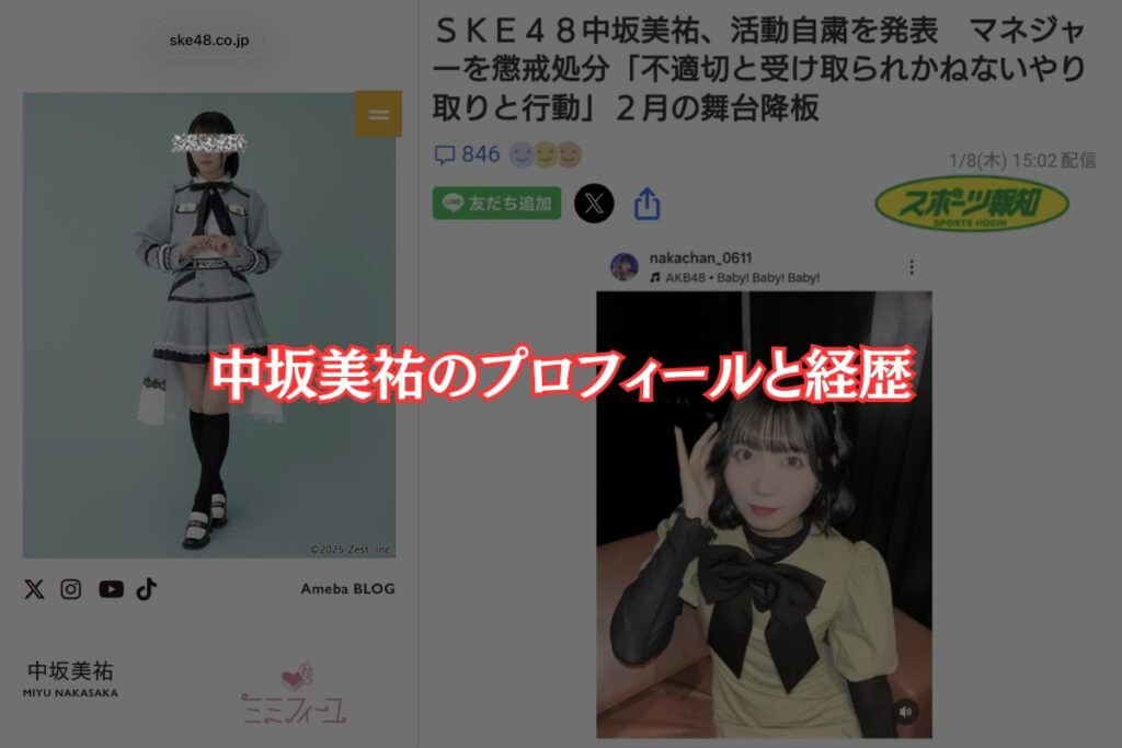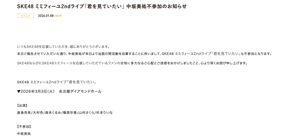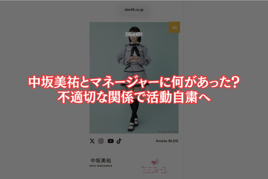 2026年1月8日、SKE48の公式サイトで、中坂美祐さんと担当マネージャーに関する衝撃的な発表がありました。運営によると、マネージャーから中坂さんに対して「業務の範疇を超える連絡」があり、調査の結果「不適切と受け取られかねないやり取りおよび、行動」が確認されたとのことです。
