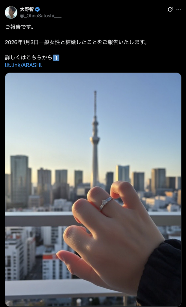 今回の騒動の発端となったのは、「大野智」を名乗るXのアカウントによる「ご報告です。2026年1月3日一般女性と結婚したことをご報告いたします」という投稿でした。もっともらしい文章と、指輪がはめられた手の画像が添えられていたため、信じてしまった人も少なくありません。しかし、このアカウントは大野智さん本人や公式とは一切関係のない「なりすましアカウント」です。